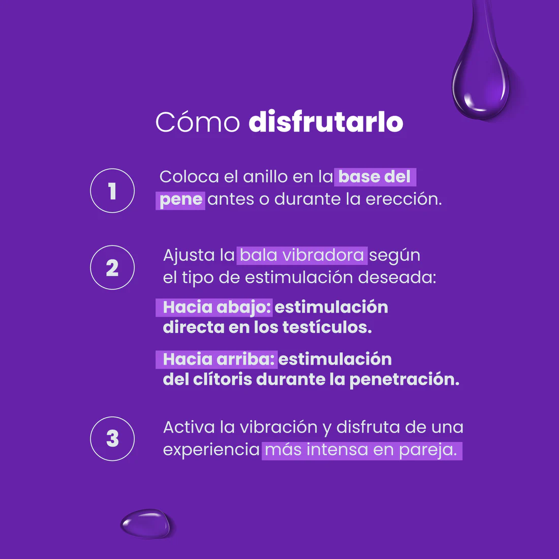 Anillo vibrador que le dará máximo placer a tí a tu pareja. Ponlo en la base del pene, sentirás una delicada presión que mantendrá tu erección durante más tiempo y tendrás más control en el momento de eyacular.